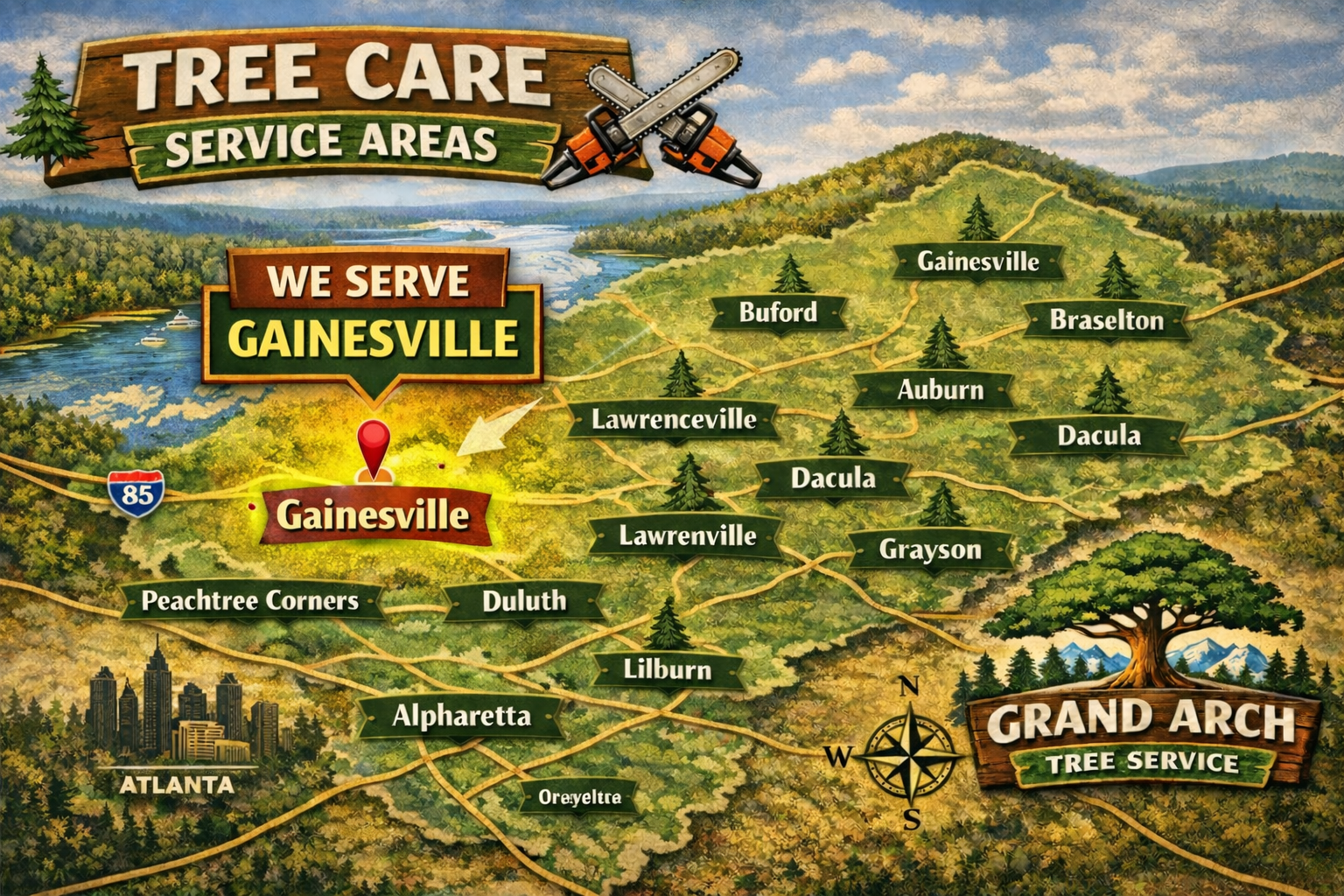 Grand Arch Tree Service proudly provides professional tree care services in Gainesville, GA, helping homeowners maintain safe, beautiful, and well-managed properties. With Gainesville’s wooded landscapes and proximity to Lake Lanier, proper tree care is essential for preventing hazards and preserving the natural beauty of your property.